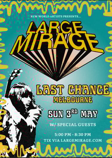 Formed in 2021 by lead vocalist and guitarist Kolya Chan, LARGE MIRAGE has quickly built a reputation for high-voltage live shows and a sound that pairs heavy rock bravado with psychedelic-pop melodies. Think flared jeans, stacked amps, fuzzed out guitars and songs meant to be played loud but warmed up with undeniable ear-candy hooks, rich three-part vocal harmonies and sophisticated songcraft.