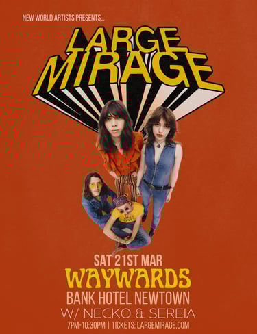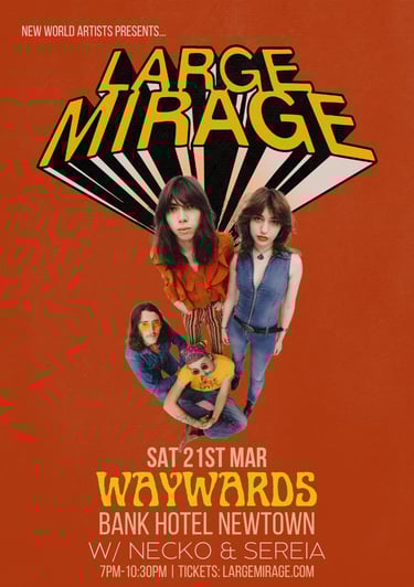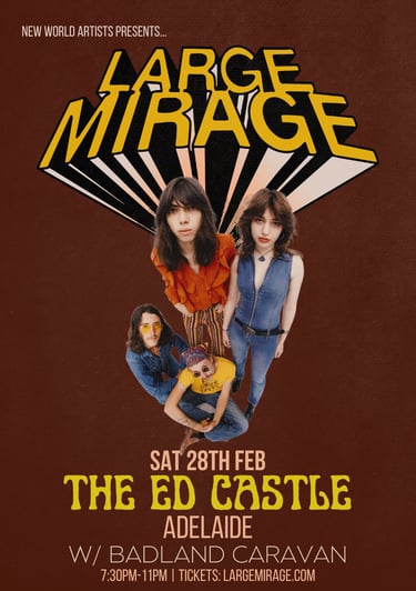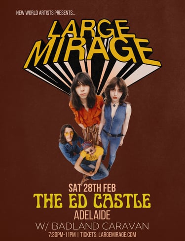 Large Mirage are an Australian rock band whose live performances are a shimmering, vintage drenched, retro psych rock experience that drags us off the sofa to see them wherever we can - in small underground venues, theatres and into stadiums around Australia.