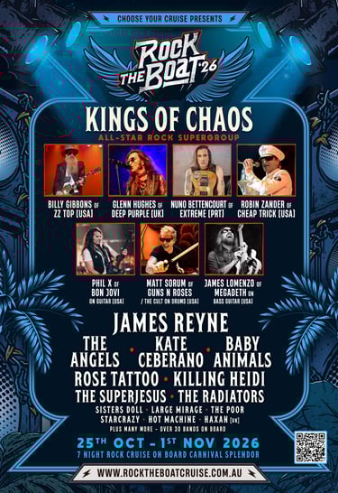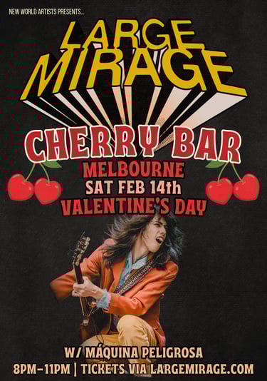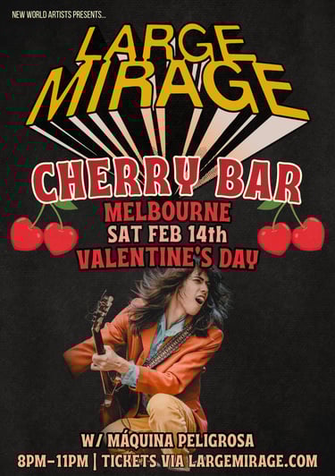 Large Mirage's versatility explains how they can tear through an opening set for AC/DC, dive deep into extended jams (and unreleased material) across four nights at WOODFORD FOLK MUSIC FESTIVAL, and feature on New Year’s Eve at LOST PARADISE FESTIVAL, while headlining an All Ages event for SUMMER CRAWL in King St Newtown, then perform four shows alongside an eclectic mix of artists on the ROCK THE BOAT CRUISE OCTOBER 2026 – all with equal conviction. Large Mirage have played on some of the biggest festival stages across Australia and performed with national icons The Screaming Jets, Diesel, Amyl and The Sniffers, and Australian Rock Collective featuring members of Powderfinger, Jet, and Spiderbait. 2026 will see Large Mirage perform another lap of the land. This is rock at its most exciting: restless, joyous, and alive in the moment.