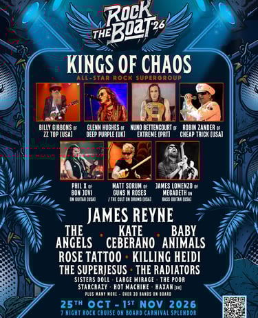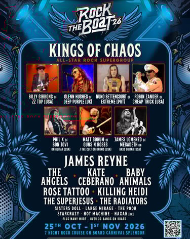 Large Mirage's versatility explains how they can tear through an opening set for AC/DC, dive deep into extended jams (and unreleased material) across four nights at WOODFORD FOLK MUSIC FESTIVAL, and feature on New Year’s Eve at LOST PARADISE FESTIVAL, while headlining an All Ages event for SUMMER CRAWL in King St Newtown, then perform four shows alongside an eclectic mix of artists on the ROCK THE BOAT CRUISE OCTOBER 2026 – all with equal conviction. Large Mirage have played on some of the biggest festival stages across Australia and performed with national icons The Screaming Jets, Diesel, Amyl and The Sniffers, and Australian Rock Collective featuring members of Powderfinger, Jet, and Spiderbait. 2026 will see Large Mirage perform another lap of the land. This is rock at its most exciting: restless, joyous, and alive in the moment.